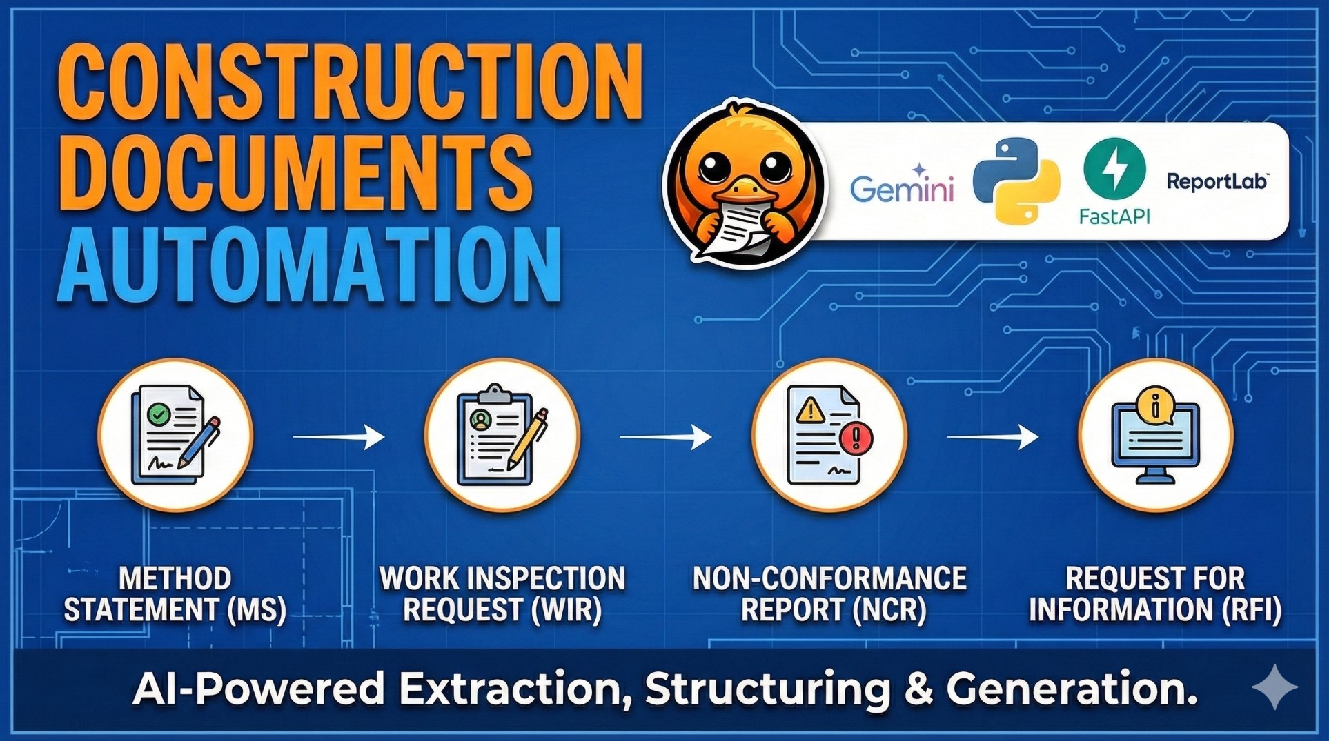 Automating extraction and generation of construction documents (WIR, NCR, RFI) using OCR and LLMs like Gemini. Streamlines method statement creation and inspection requests.